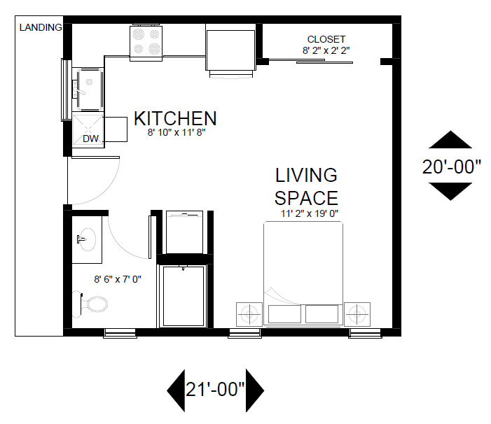 | ROOMS | Living Space: width 11’02” x depth 19′ Den: width 10′ x depth 10′ Kitchen: width 8’10” x depth 11′ 8″ |
