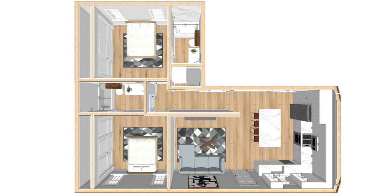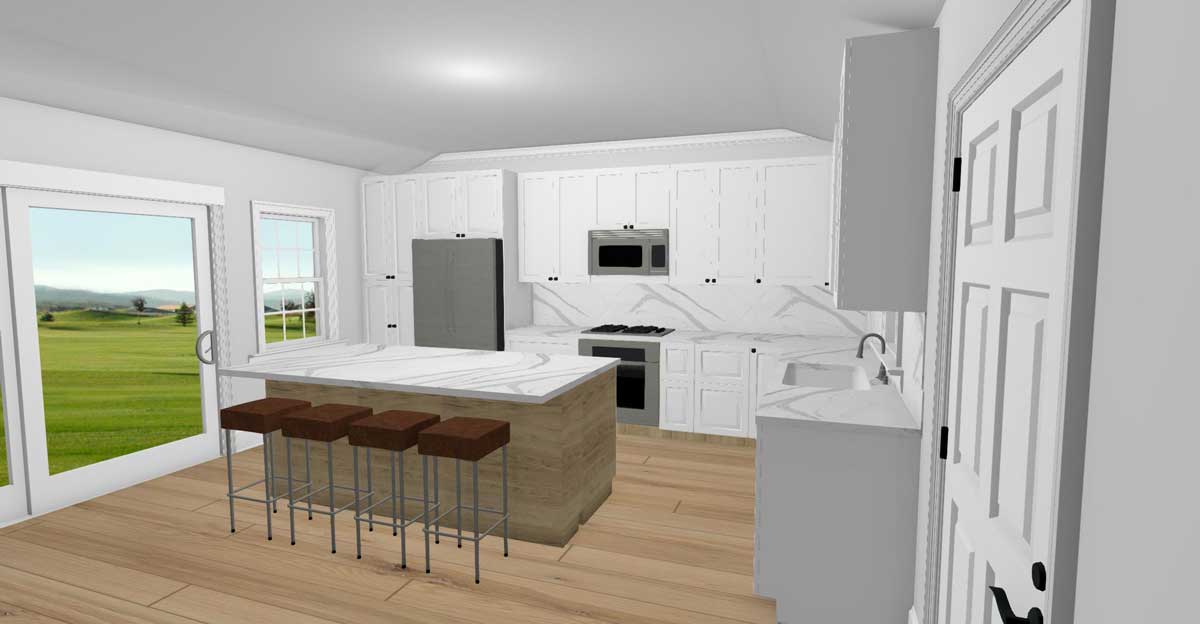 Interior Elevations 3D Rendering images of building interiors, including windows and doors locations. Suggested interior finish.
