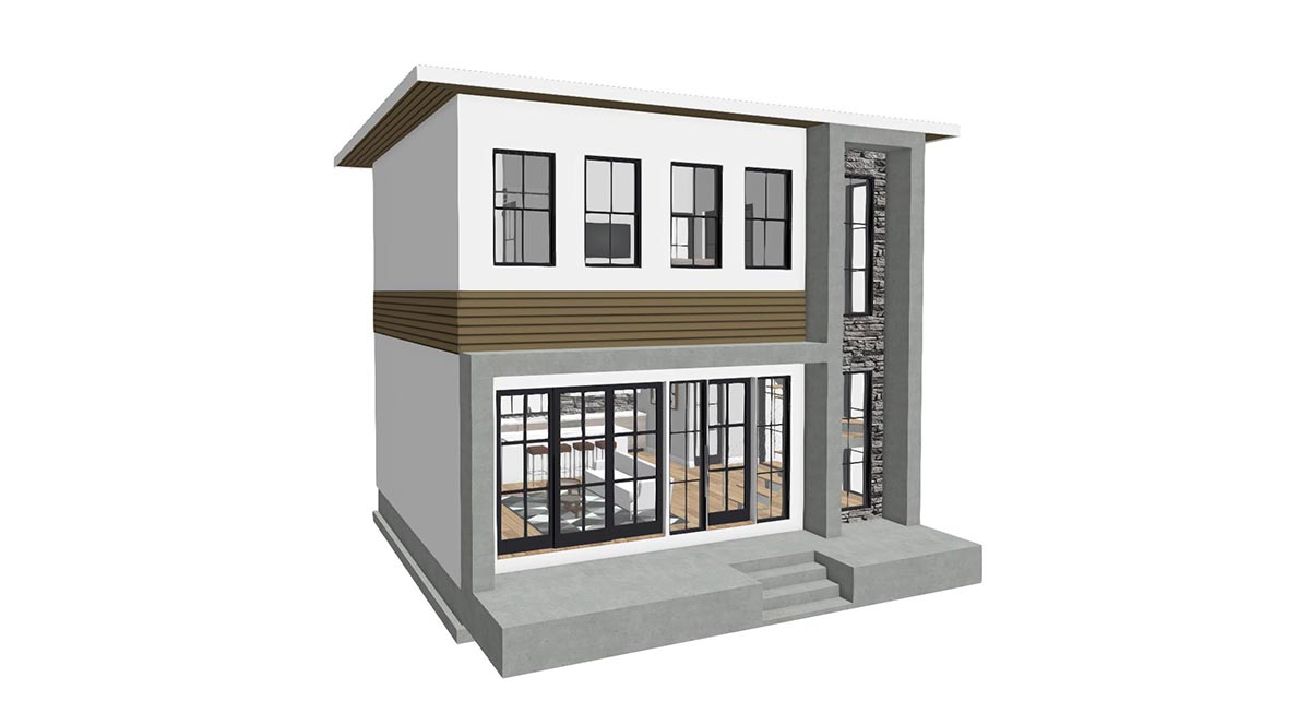 | Exterior Elevations | 3D Rendering images of building exterior, including window and doors locations. Suggested exterior finish. |